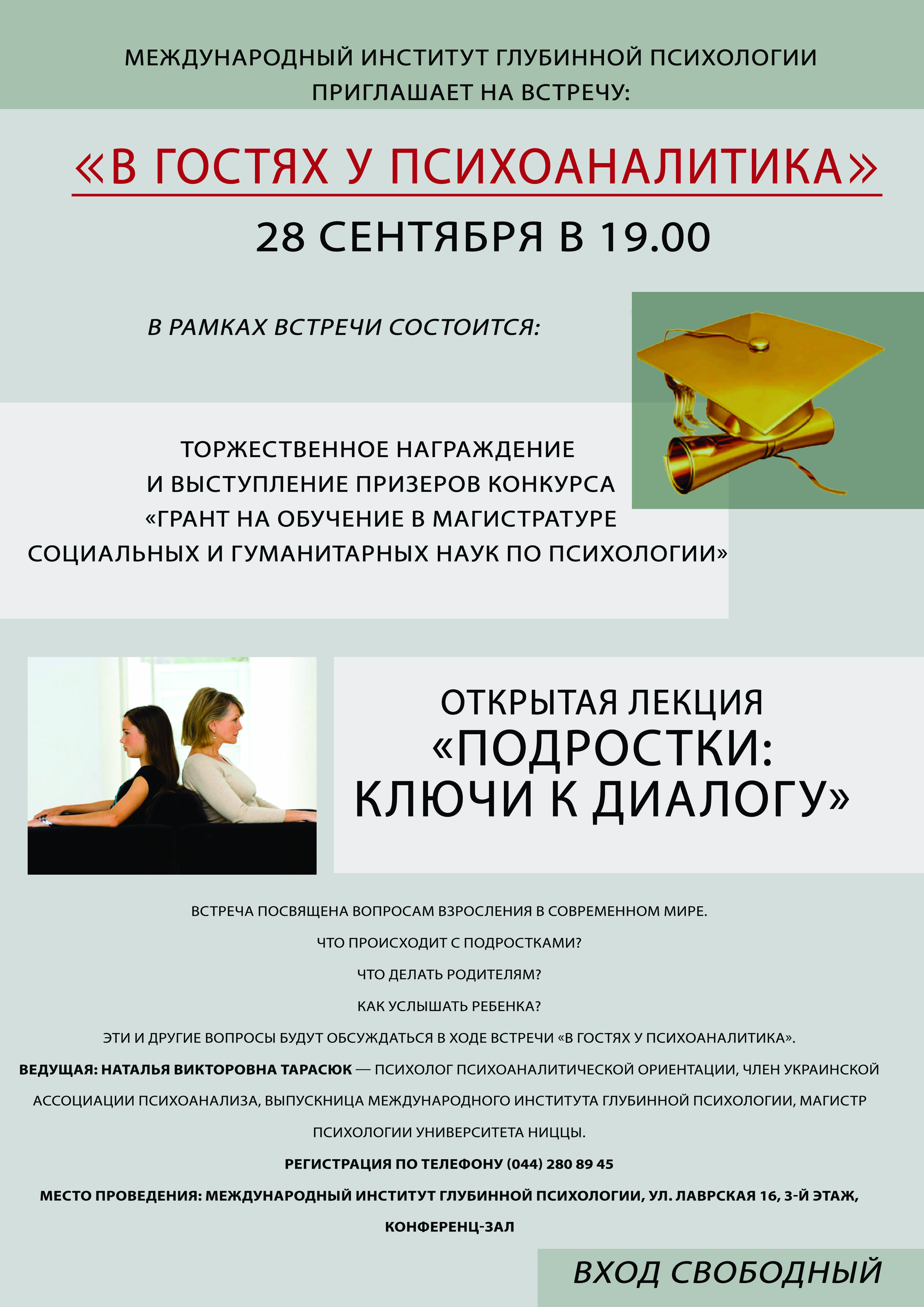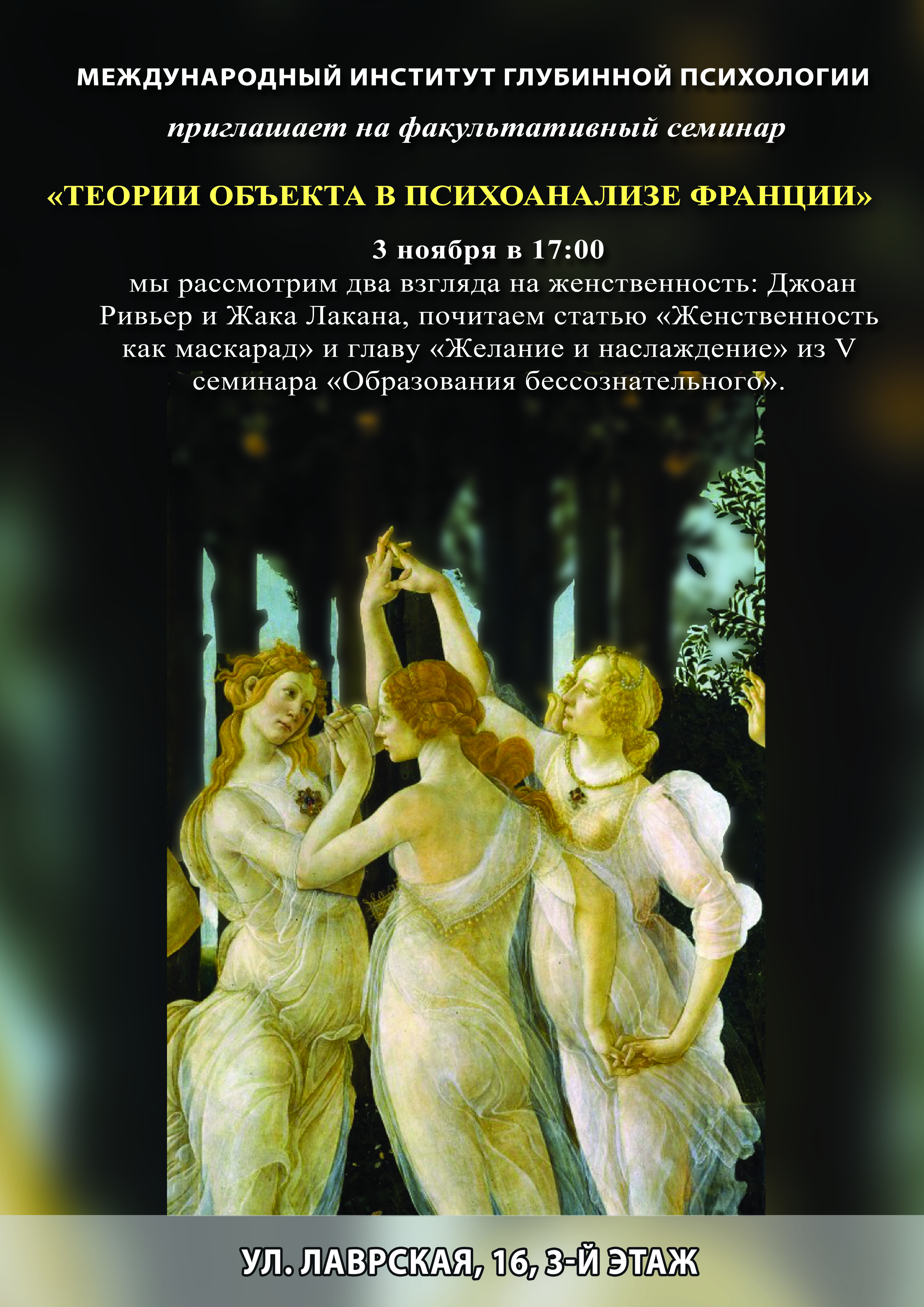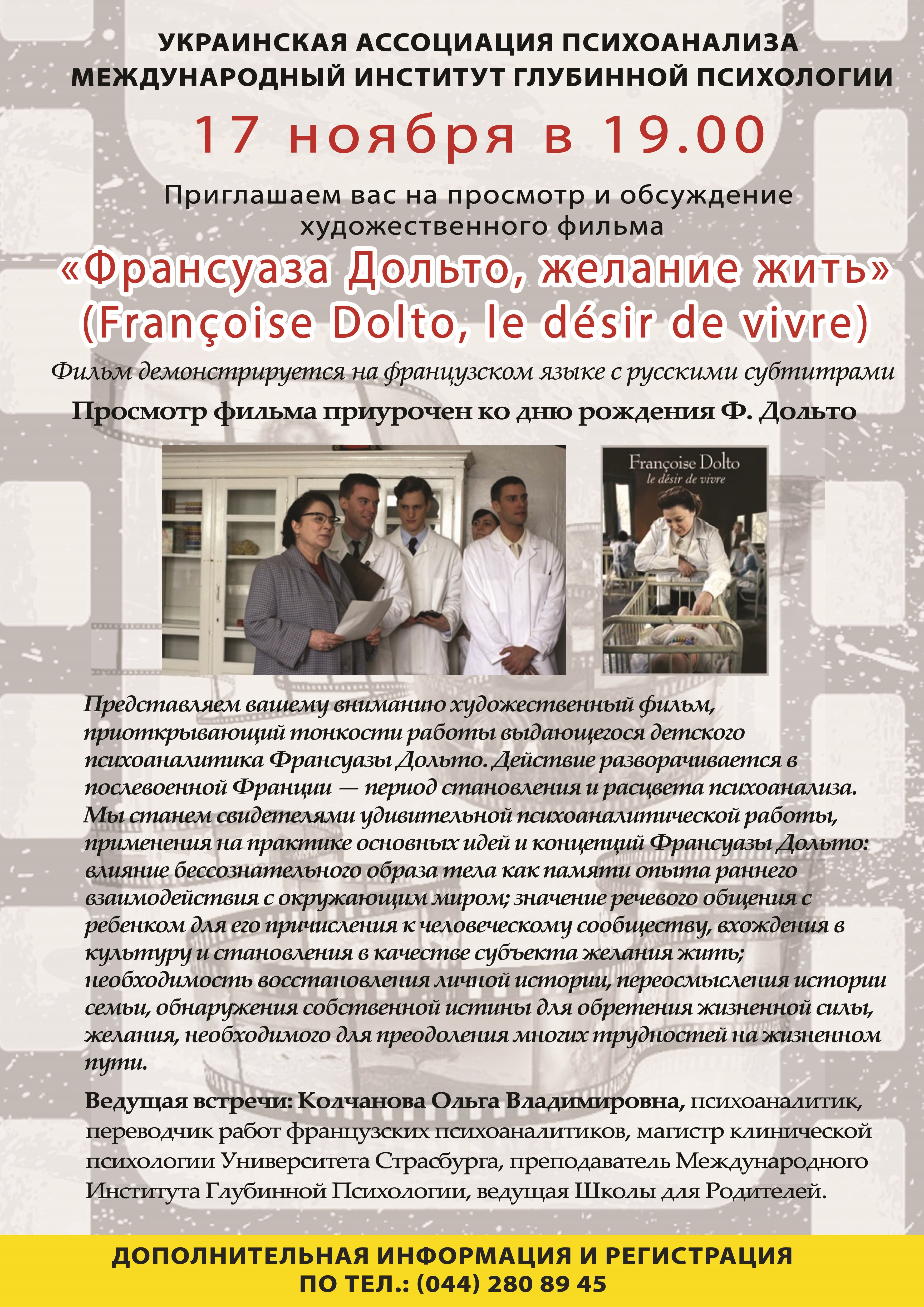 Украинская Ассоциация Психоанализа Международный Институт Глубинной Психологии 17 ноября в 19.00 Приглашаем вас на просмотр и обсуждение художественного фильма «Франсуаза Дольто, желание жить» (Françoise Dolto, le désir de vivre) Фильм демонстрируется на французском языке с русскими субтитрами Просмотр фильма приурочен ко дню рождения Ф. Дольто Представляем вашему вниманию художественный фильм, приоткрывающий тонкости работы выдающегося детского […]