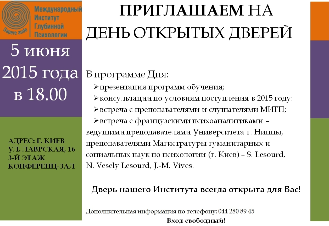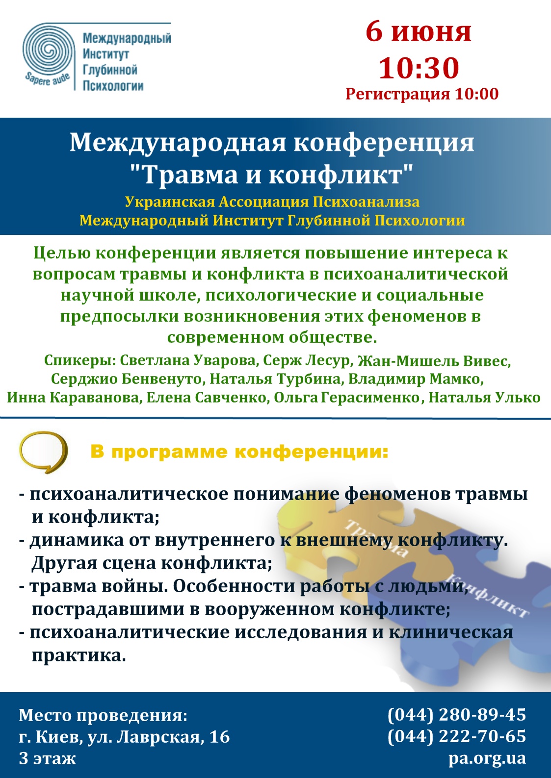 6 июня на базе Международного Института Глубинной Психологии (МИГП) пройдет конференция «Травма и конфликт». Организатором выступила Украинская Ассоциация Психоанализа (УАП) при поддержке МИГП.